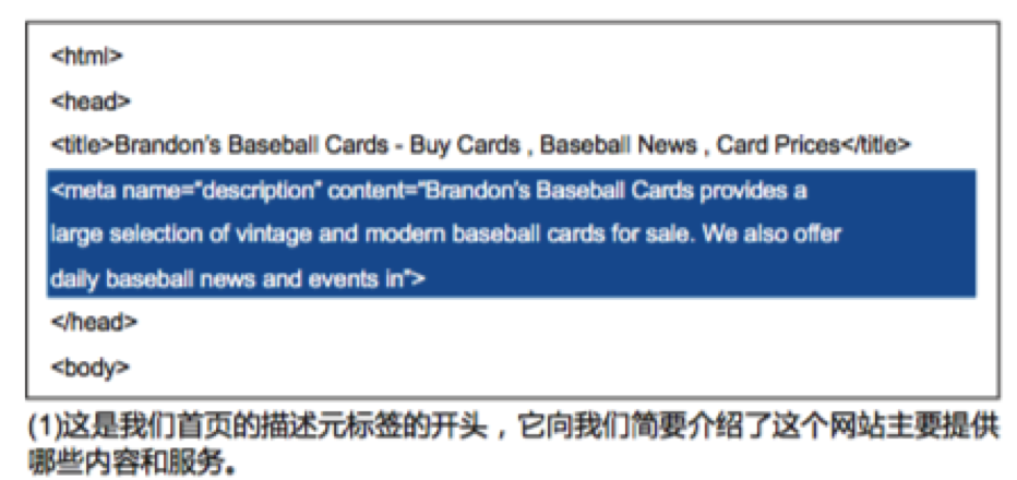 請(qǐng)注意避免 : 與網(wǎng)頁(yè)實(shí)際內(nèi)容不相符的描述元標(biāo)簽; 過于寬泛的描述 , 比如“這是一個(gè)網(wǎng)頁(yè)”或“關(guān)于棒球卡的網(wǎng)頁(yè)”等 ;在描述部分堆砌關(guān)鍵詞 ;把網(wǎng)頁(yè)的所有內(nèi)容都復(fù)制到描述元標(biāo)簽中